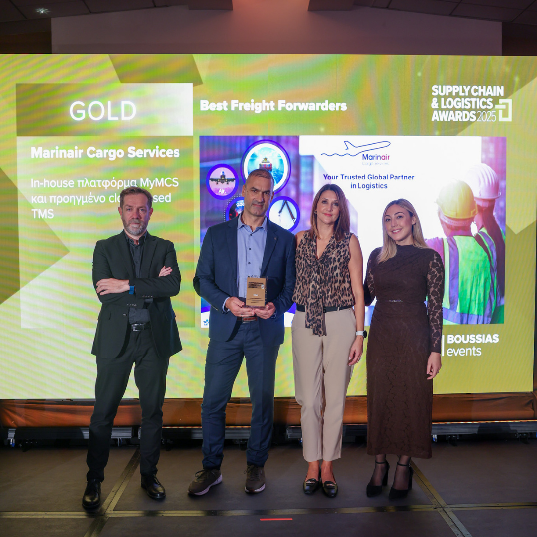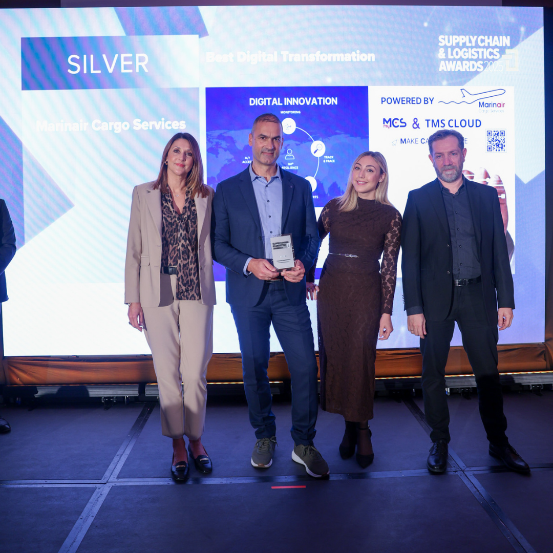 Είμαστε περήφανοι να ανακοινώσουμε ότι η Marinair Cargo Services τιμήθηκε με δύο σημαντικές διακρίσεις στα Marinair Supply Chain & Logistics Awards 2025, γεγονός που αντανακλά τη διαρκή δέσμευσή μας στην αξιόπιστη διαμετακόμιση φορτίων, την ψηφιακή αποδοτικότητα και τη διεθνή διασυνδεσιμότητα.